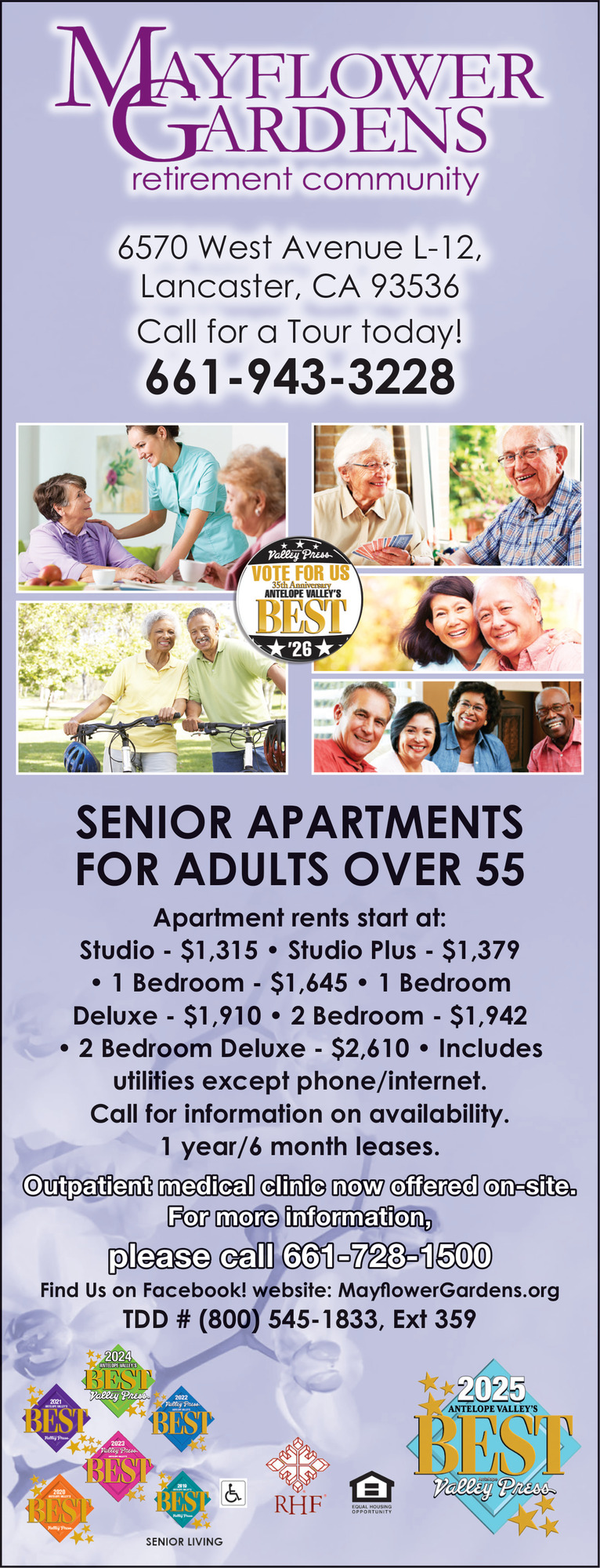Jan 30, 2026. Mayflower Gardens Senior Living Ads from The Antelope Valley Press